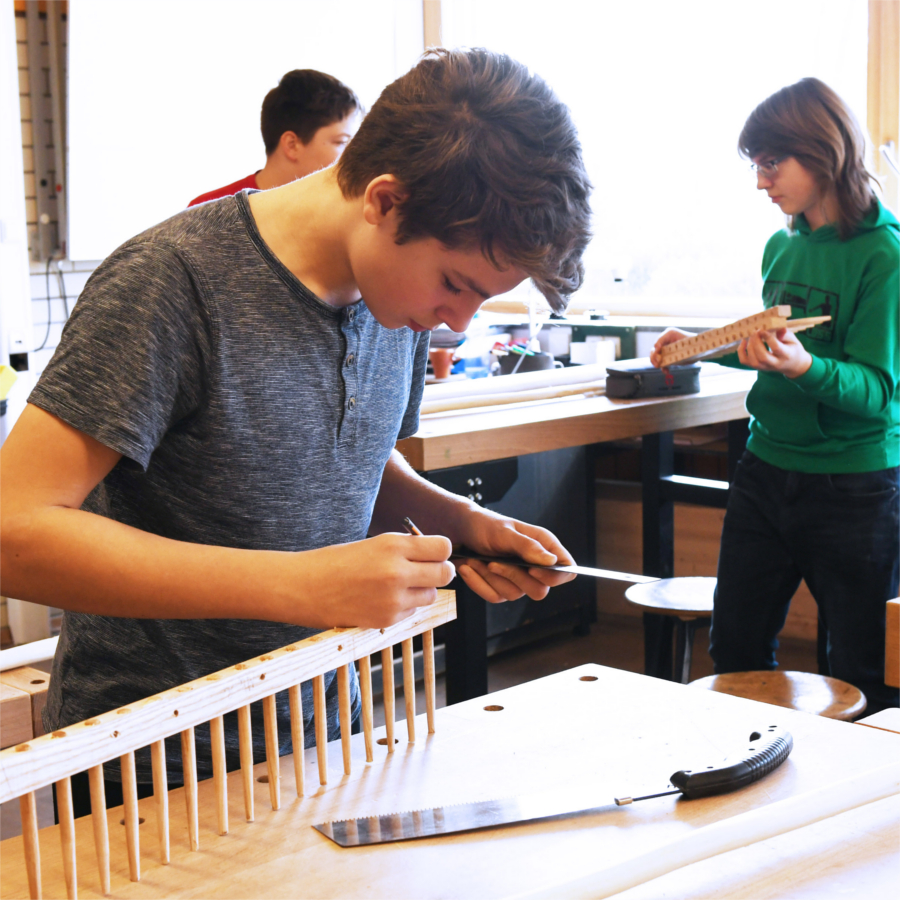 Doch man glaube nicht, dass das alles so einfach wäre. Bühner macht den aufmerksam zuhörenden Schülern immer wieder klar, und er spricht aus langer Erfahrung, worauf es ankommt: z. B. auf das passgerechte Schnitzen von Zinken für den „Hääd“ (= Sandberger Mundart, soviel wie „Haupt“ oder „Kopf“), dass dort die Bohrungen akkurat vorgenommen sein müssen, dass die aus Haselnussästen naturgewachsenen Stiele in ihrem Schwerpunkt erfasst und in einem bestimmten Winkel eingestielt werden, dass sie dazu auch in einem bestimmten Winkel erst angespitzt werden. Methoden, wie man Holz glättet, lernen die Schüler, u. a. mit der verblüffend einfachen, aber wirkungsvollen Glasscherbe. Messen lernen sie mit dem Metermaß und dem Schreinerwinkel, begreifen, wie man Holzteile verzapft, ohne einen einzigen Topfen Tischlerleim zu gebrauchen; wie man sich zu einem sauberen Sägeschnitt anstellt und wie man schließlich insgesamt einen ganzen Bauplan erlernt mit allen seinen Einzelabläufen.