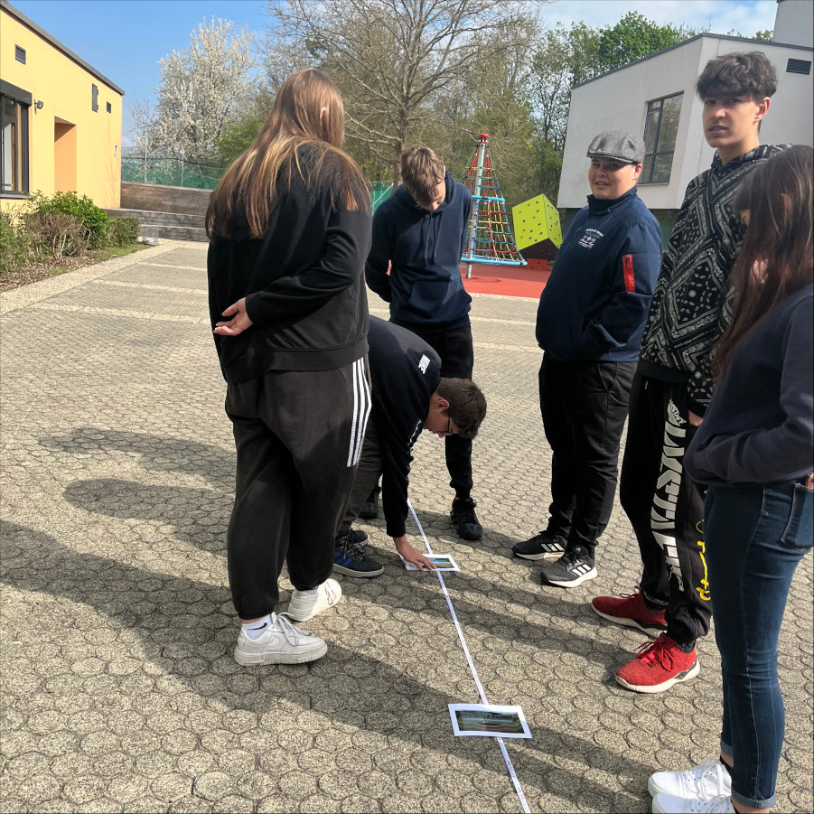 Zur Verdeutlichung, wie lange fossile Rohstoffe genau zur Entstehung brauchen, wurde ein 30 Meter langes Maßband in den Pausenhof gelegt. Die Schüler verteilten zeitgeschichtliche Ereignisse, wie beispielweise die Erfindung des Autos und von Heizungen, die Zeit der Dinosaurier und die schrittweise Entstehung von Erdöl auf dem Zeitstrahl.